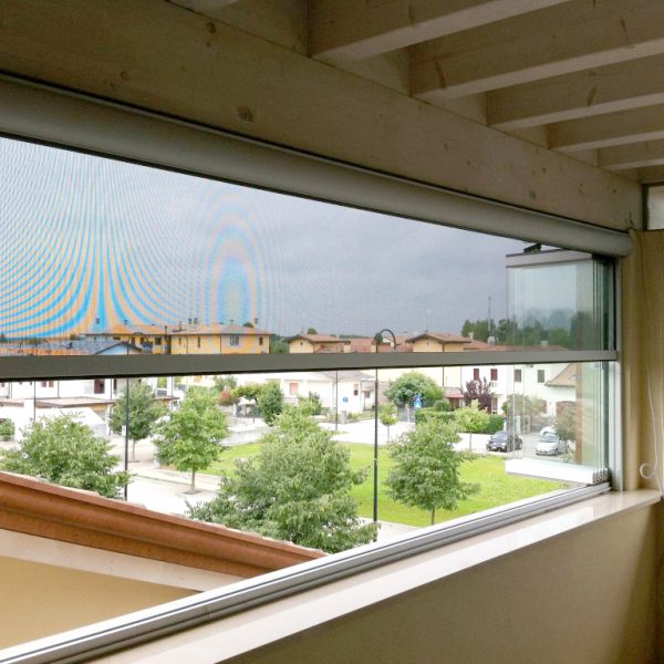 Zanzariere a rullo con guide e profilo di chiusura in alluminio e guida interna in PVC con alette per il trattenimento del telo con Zip; con cassonetto; manovra a catena, argano o motore.